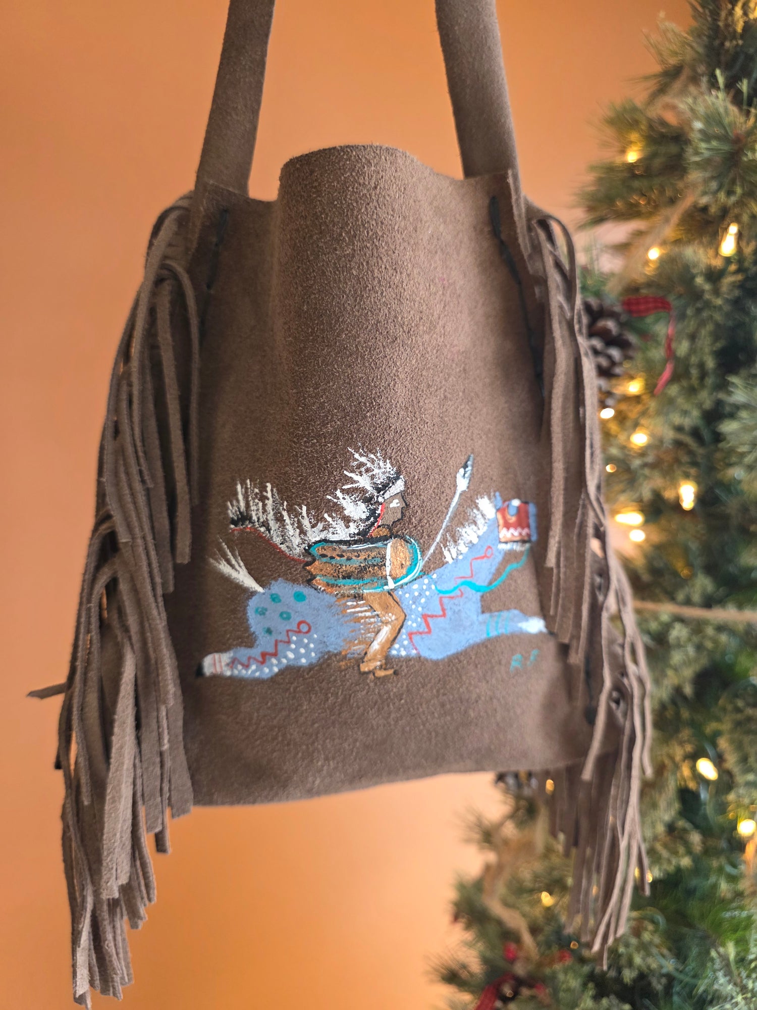 The centerpiece is a striking hand-painted scene by artist Roslan Fitchner, depicting a Native rider in vibrant colors, captured mid-motion with powerful brushwork and intricate detailing. The imagery, alive with spirit and energy, celebrates resilience, heritage, and storytelling through art.