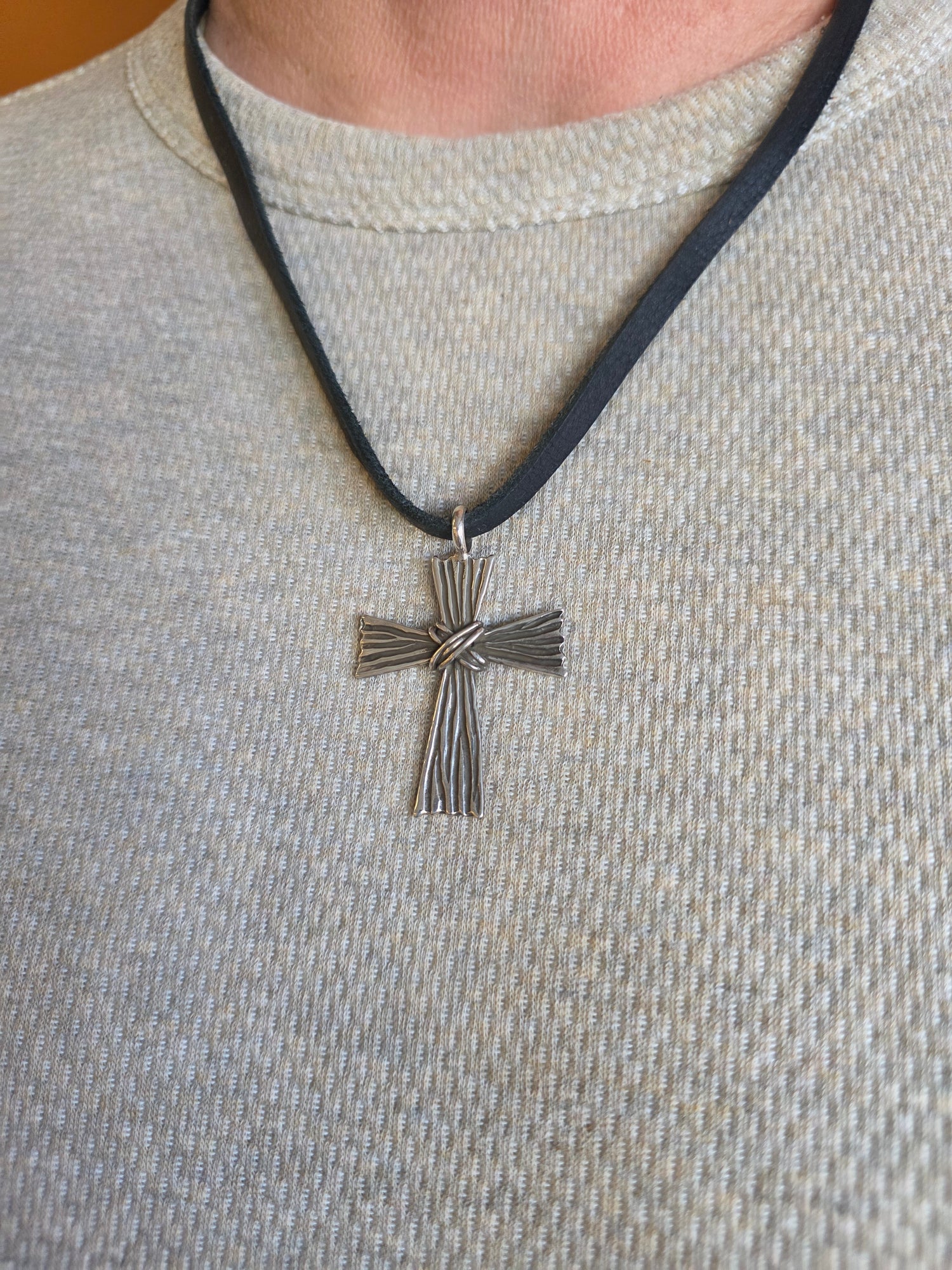 This handcrafted sterling silver cross by Edison Piaso is a bold yet timeless statement of faith and craftsmanship. The cross features a distinctive wrapped design with textured silver arms that create depth and movement, symbolizing unity and strength. Hung on a sleek black leather cord, it offers a perfect balance of rugged style and spiritual meaning.