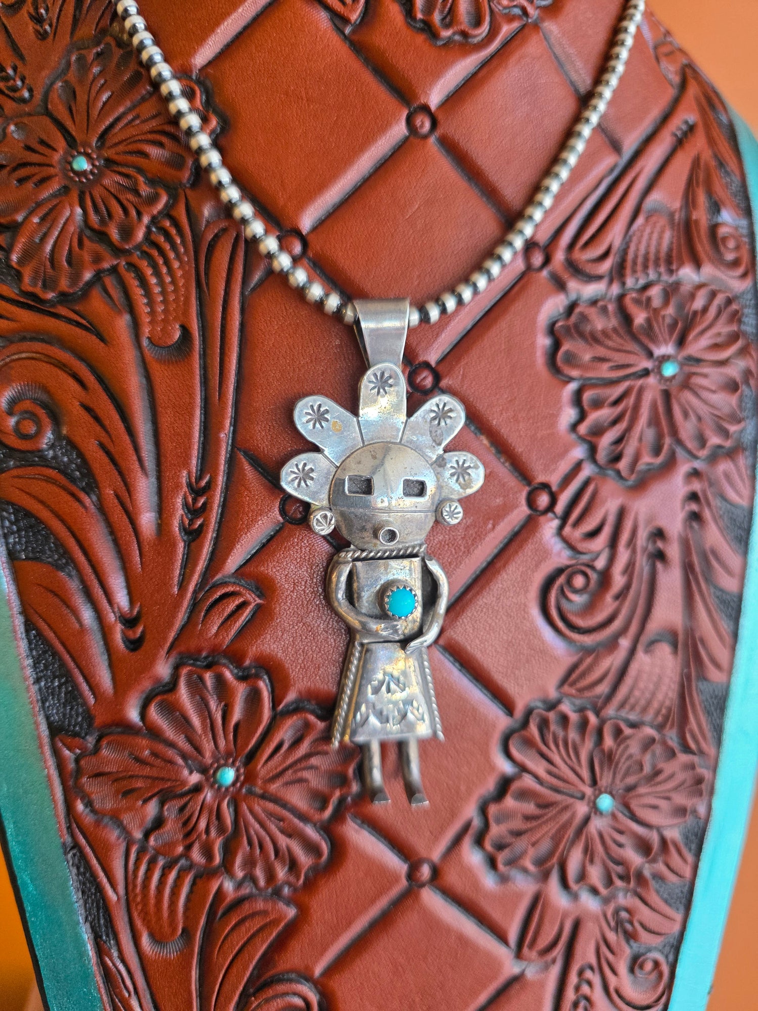 This vintage Kachina pendant is crafted in sterling silver and features a classic stylized Kachina figure with detailed stamp work and a small turquoise accent set at the center. The figure displays traditional design elements, including articulated details and decorative stamped motifs, giving the piece strong Southwestern character. Suspended from a silver beaded chain, this pendant has a wonderful vintage presence and wears beautifully as a statement piece.