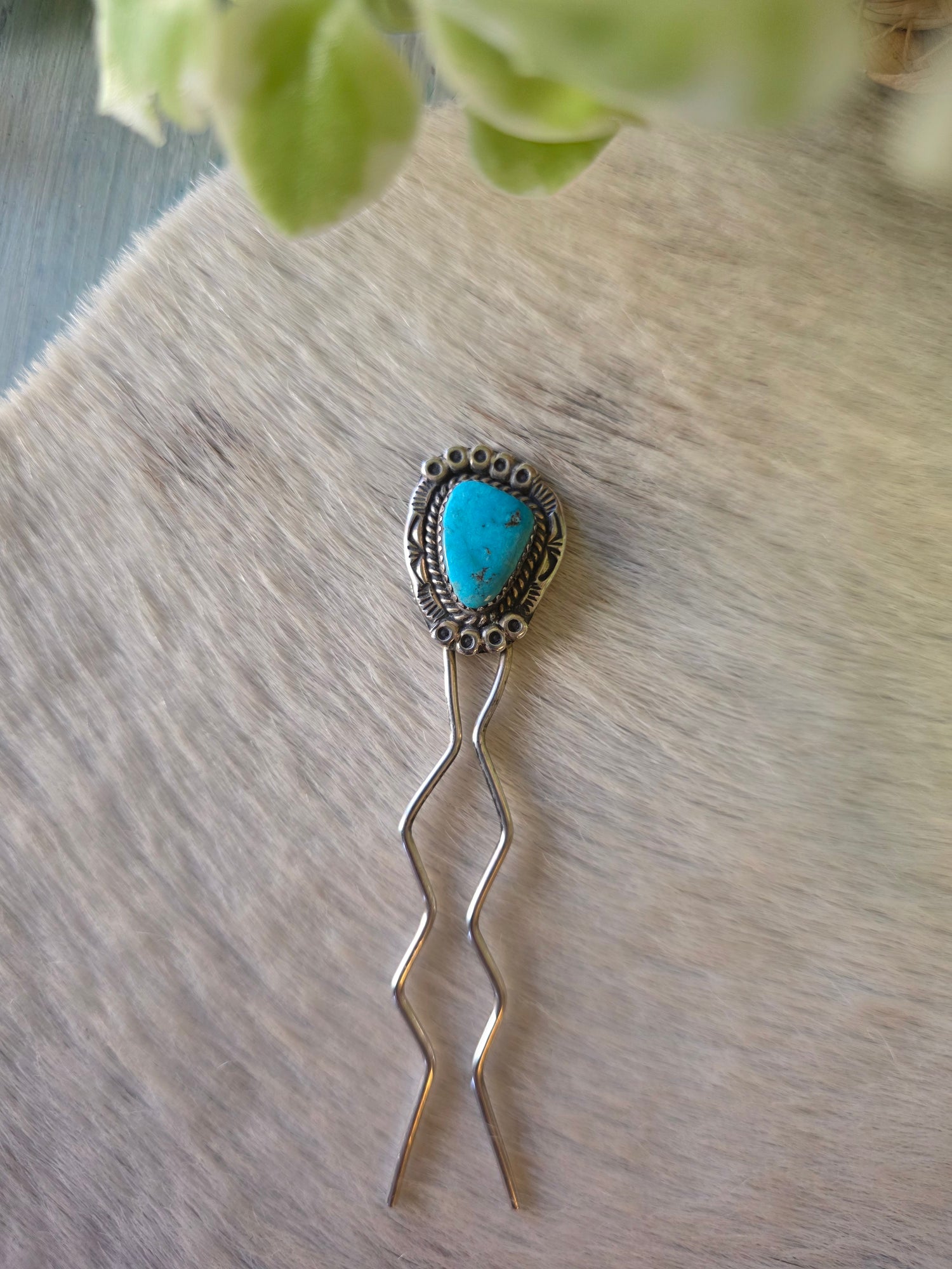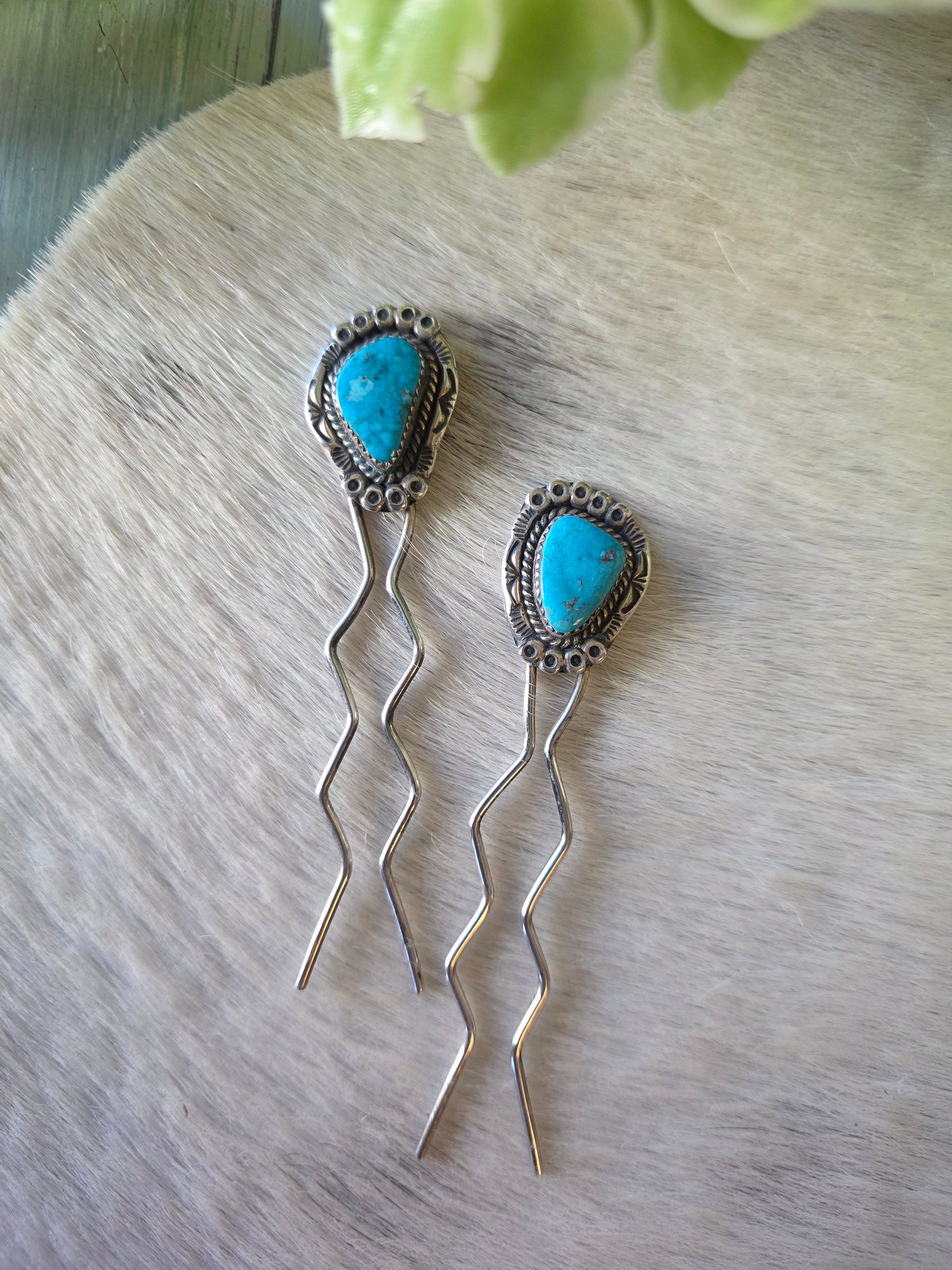 These vintage hair pins feature bright turquoise cabochons set in hand-tooled sterling silver bezels. Each pin is finished with decorative stamped detailing and long, wavy sterling prongs designed to securely hold hair in place. Stamped DY, these hair accessories reflect classic Southwestern style and solid craftsmanship. Beautifully functional and highly collectible, they can be worn as hair pins or displayed as part of a vintage jewelry collection.