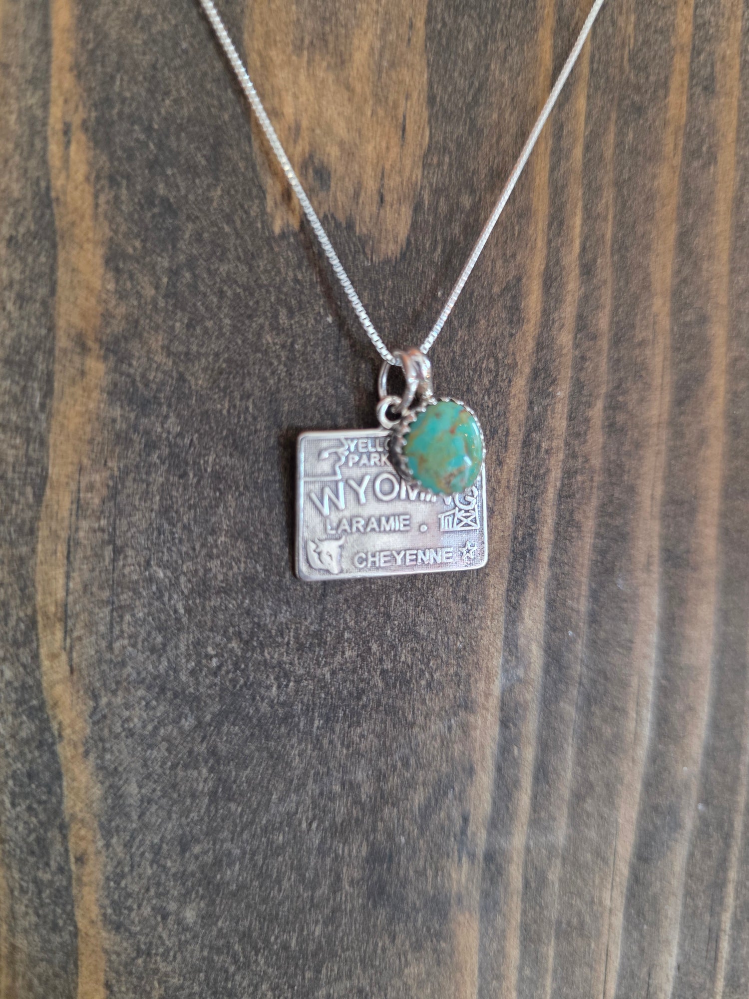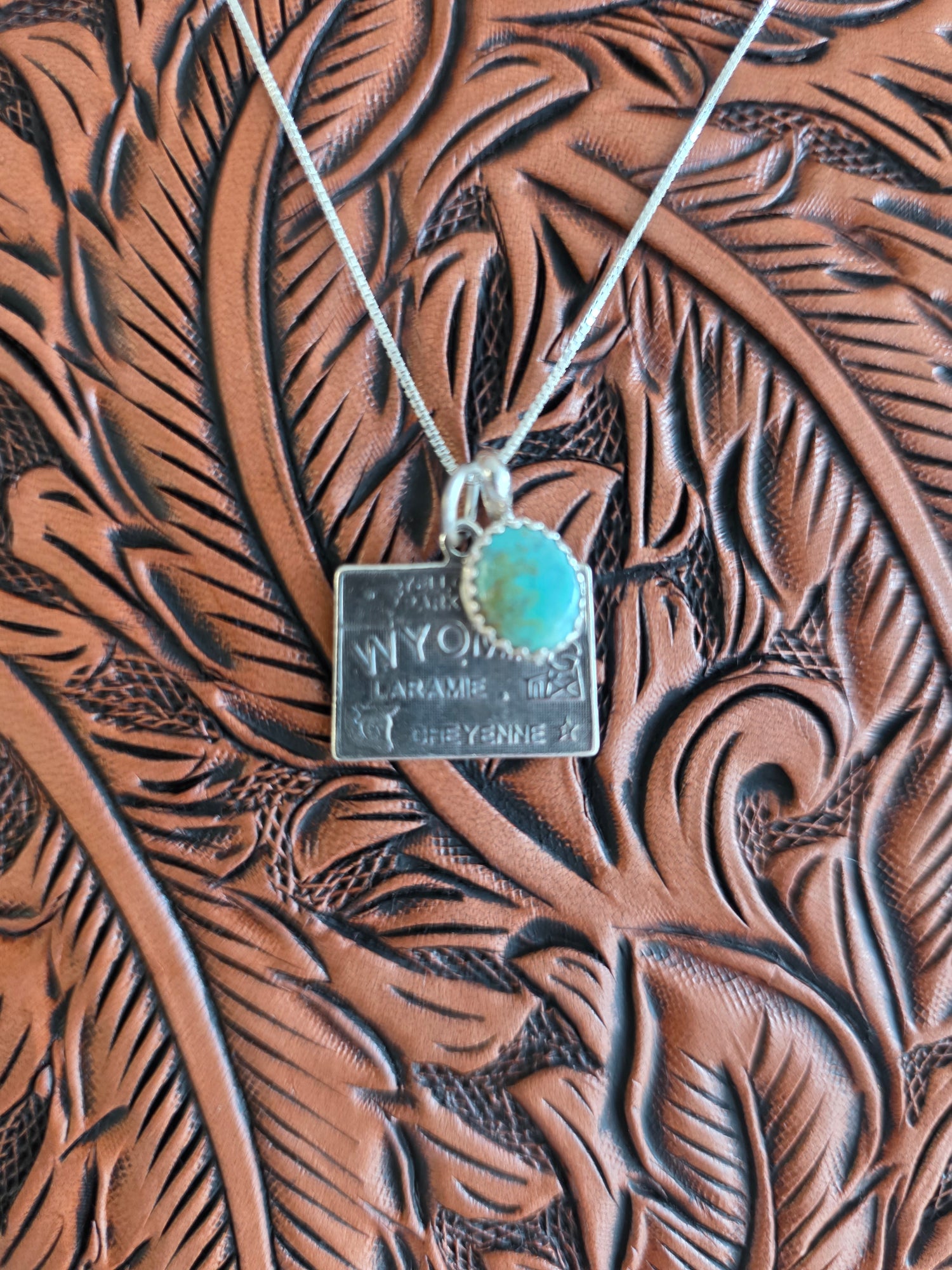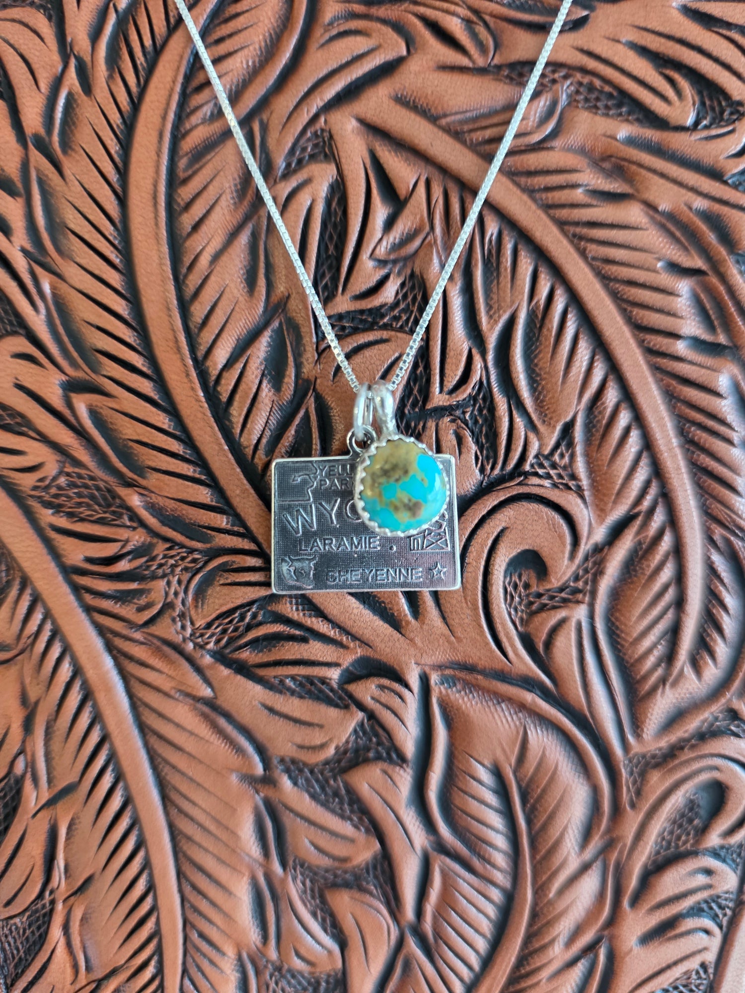 Celebrate the spirit of the Cowboy State with this handcrafted Wyoming Turquoise Charm Necklace. The pendant features a detailed sterling silver Wyoming state charm paired with a genuine turquoise stone, bezel-set with classic rope edging for a timeless Southwestern touch. Hung from a sleek sterling chain, this piece blends state pride with artisan style—perfect for gifting, layering, or wearing as an everyday reminder of home.