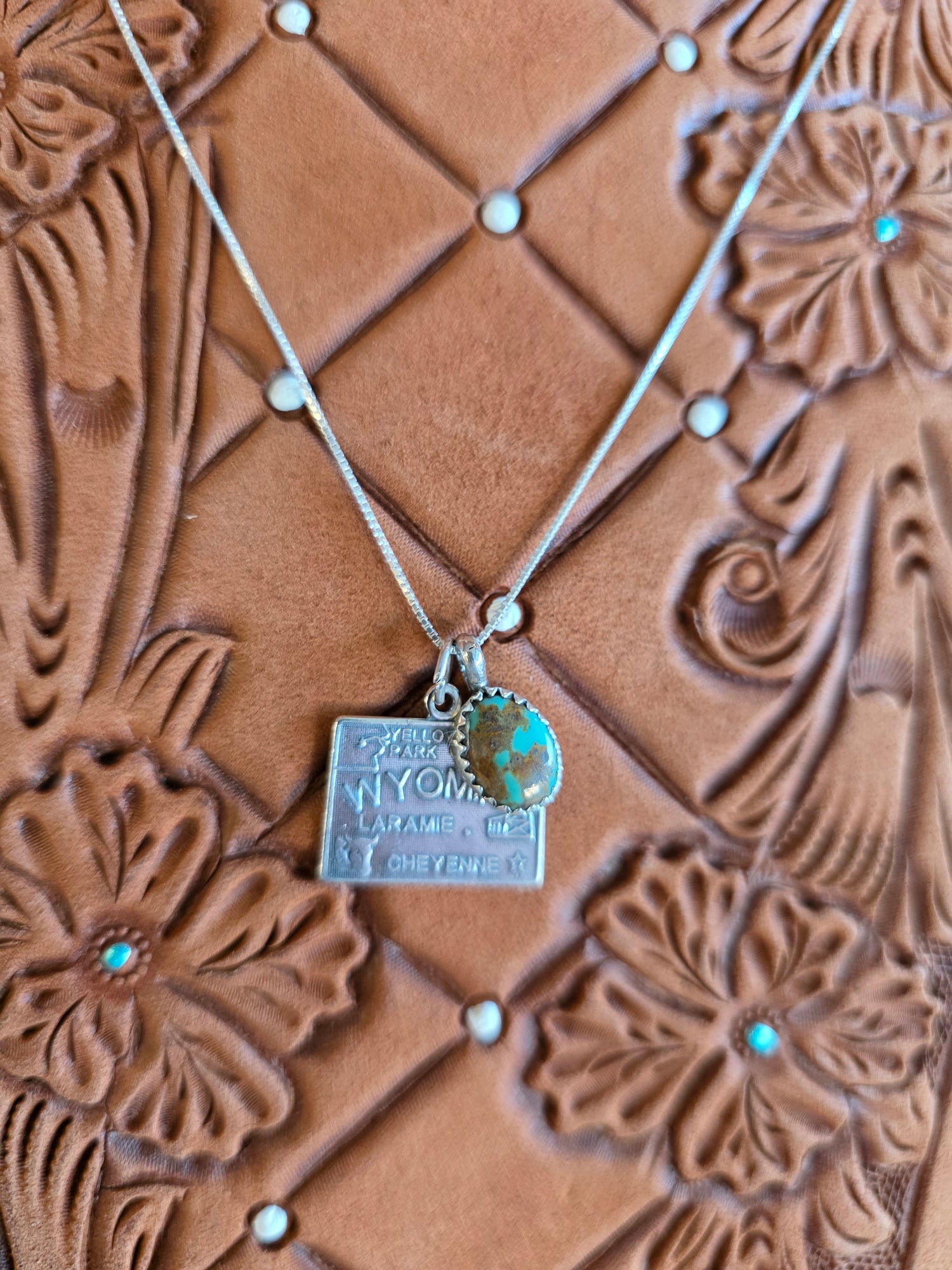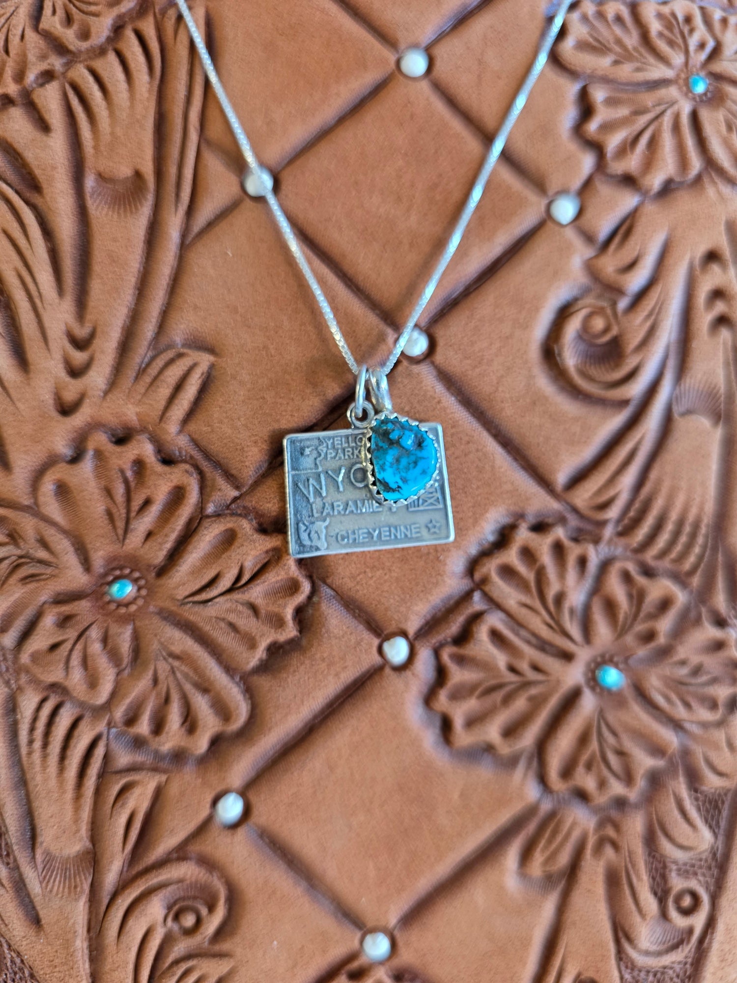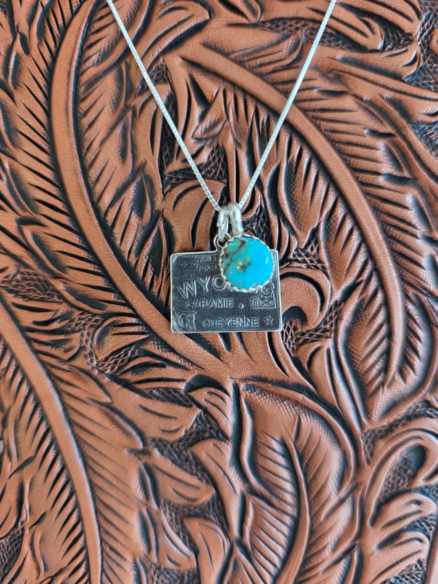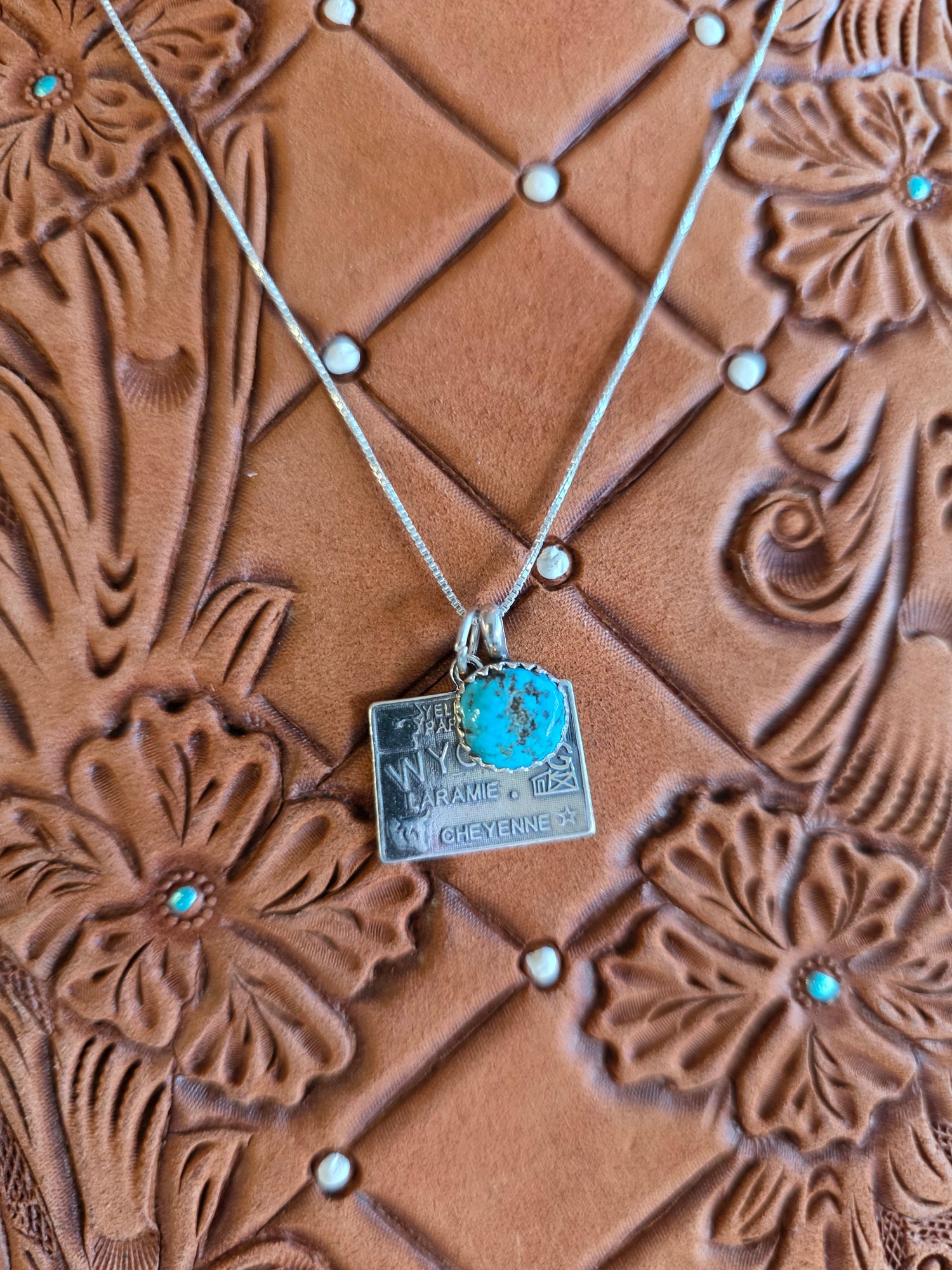 Celebrate the spirit of the Cowboy State with this handcrafted Wyoming Turquoise Charm Necklace. The pendant features a detailed sterling silver Wyoming state charm paired with a genuine turquoise stone, bezel-set with classic rope edging for a timeless Southwestern touch. Hung from a sleek sterling chain, this piece blends state pride with artisan style—perfect for gifting, layering, or wearing as an everyday reminder of home.