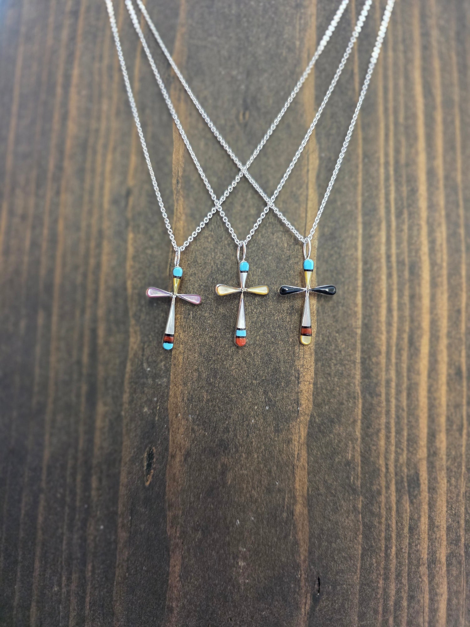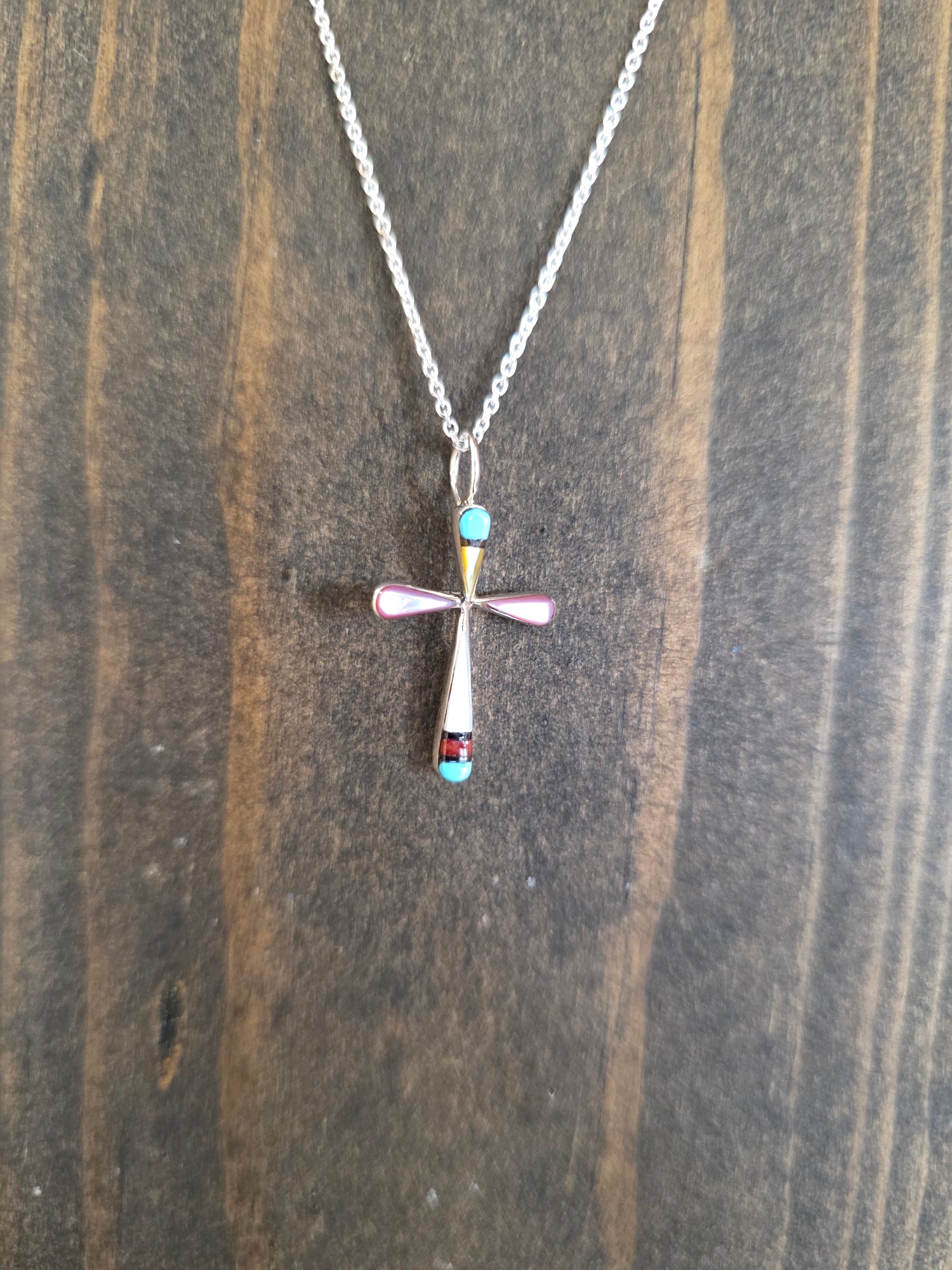 Zuni Petite Turquoise Shell Silver Inlay Cross Pendant Necklace