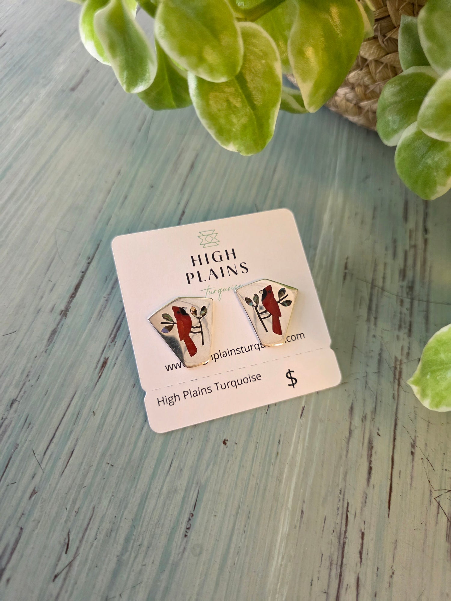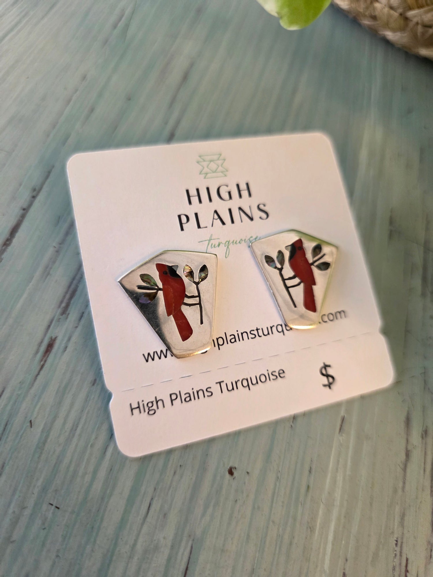 These remarkably lifelike Zuni Bird post earrings are the work of the renowned inlay artist SC Edaakie, bearing his signature. Featuring vivid Red Cardinals framed by abalone leaves, the detailed carving and inlay work bring these elements to stunning life, making these earrings a beautifully crafted and striking accessory.